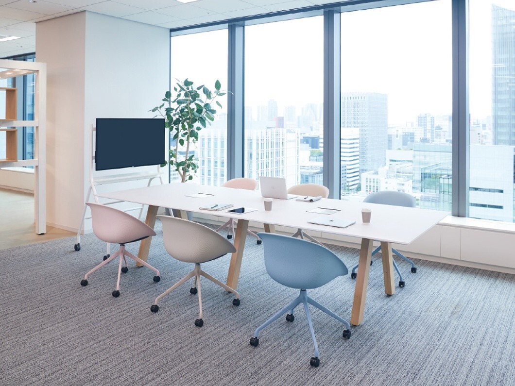 以某科技公司為例,他們將會議室座位由傳統長桌改為 U 型環形桌,配合人體工學椅與可移動屏風: