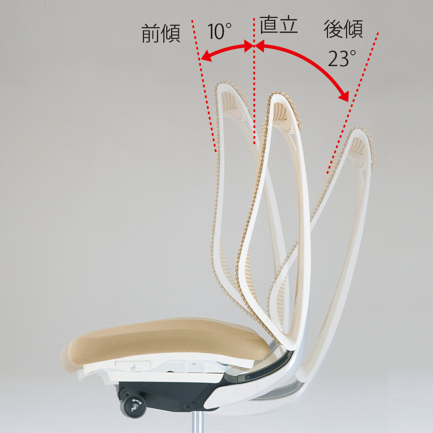 傾斜範圍為從直立到向後傾斜 23°,從直立到向前傾斜 10°。 傾斜固定有 4 階段。