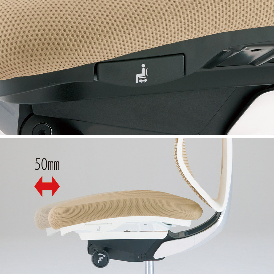 椅墊調節可於椅墊下方兩側撥片調整,調整長度50mm